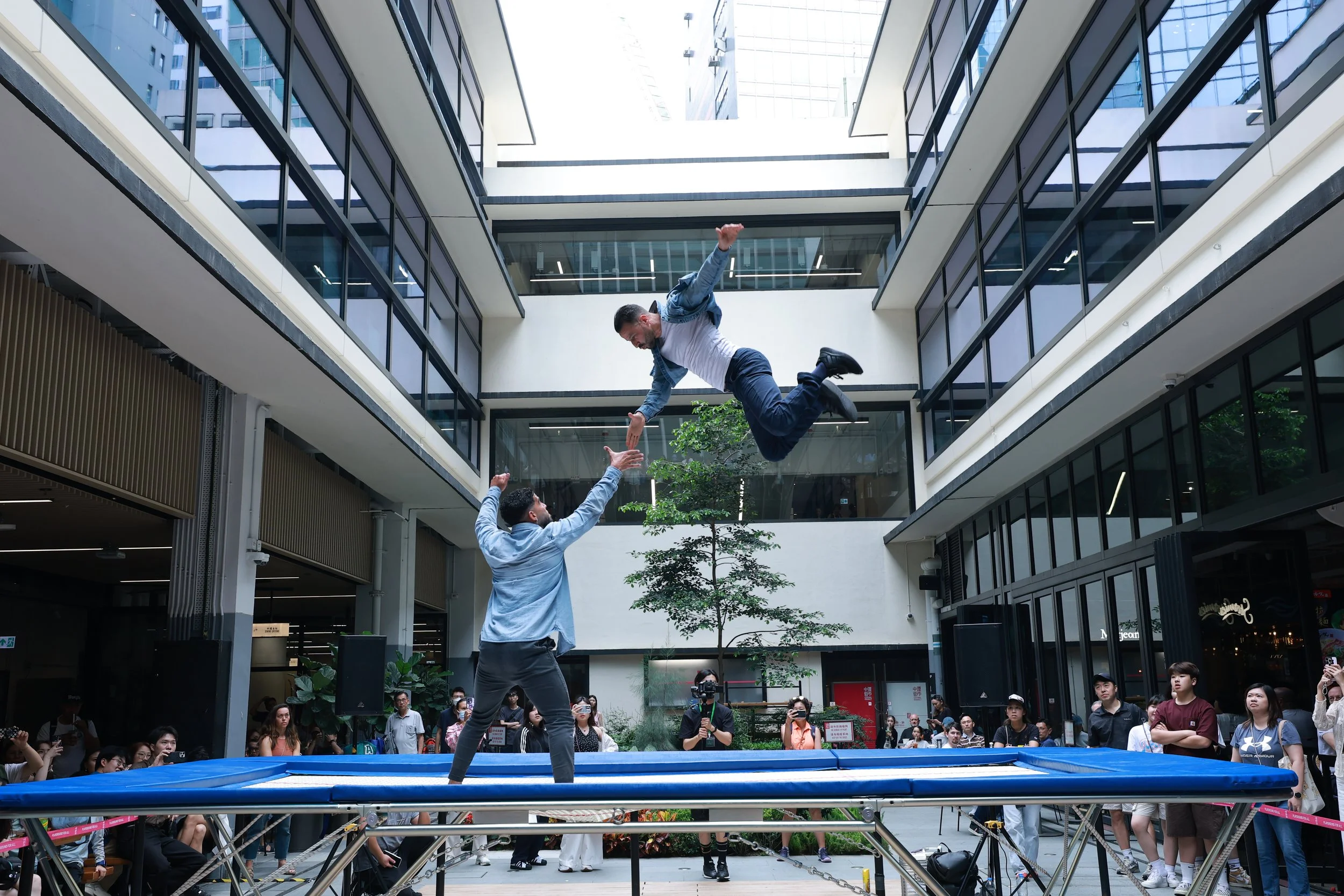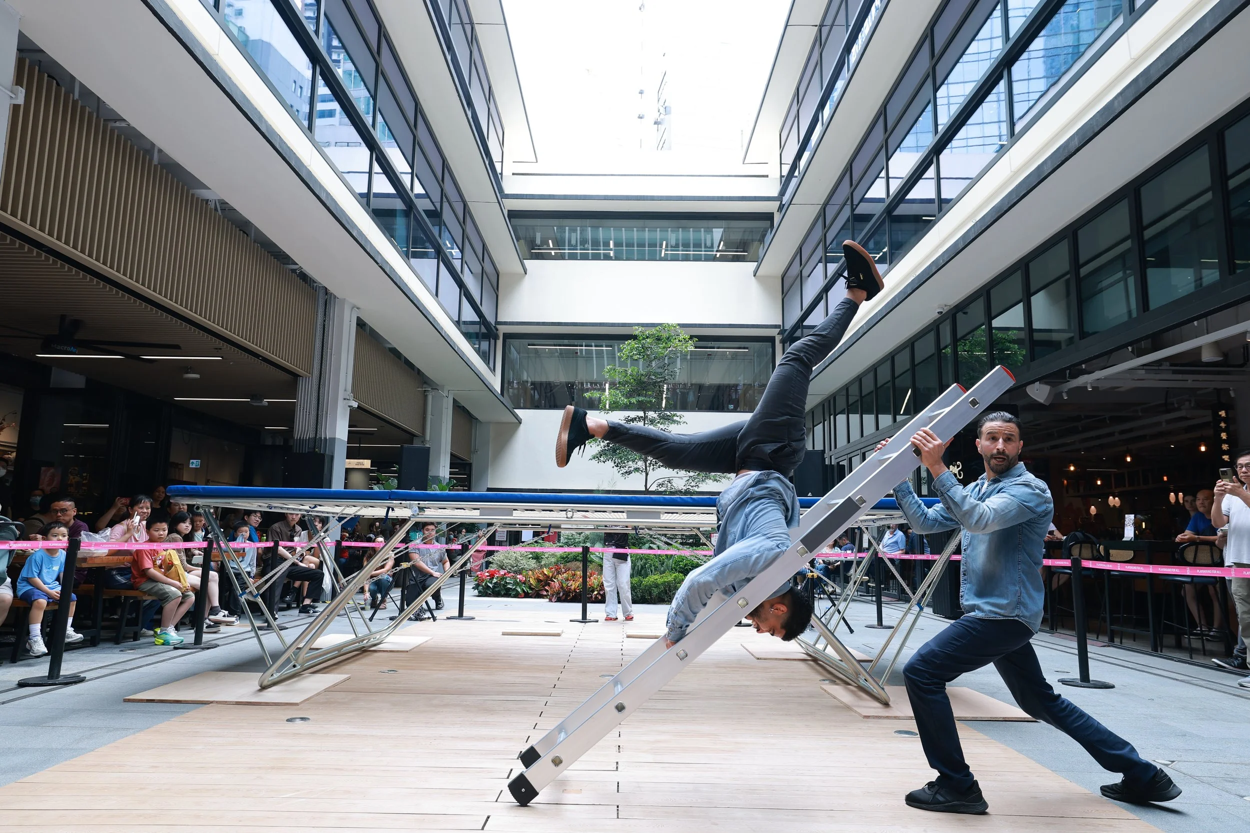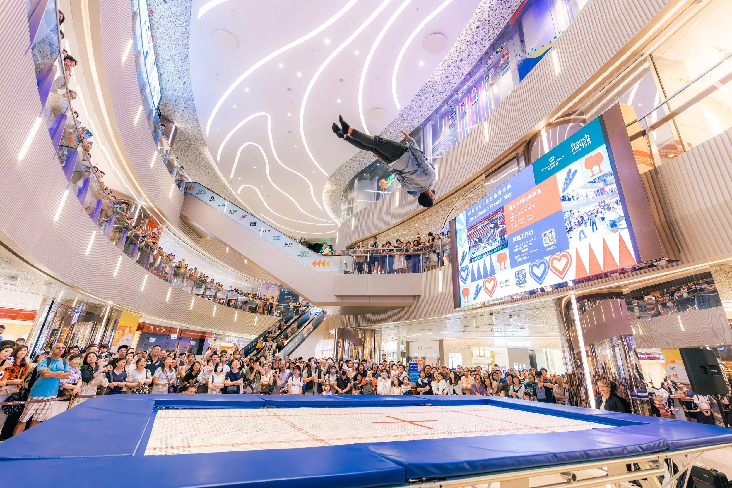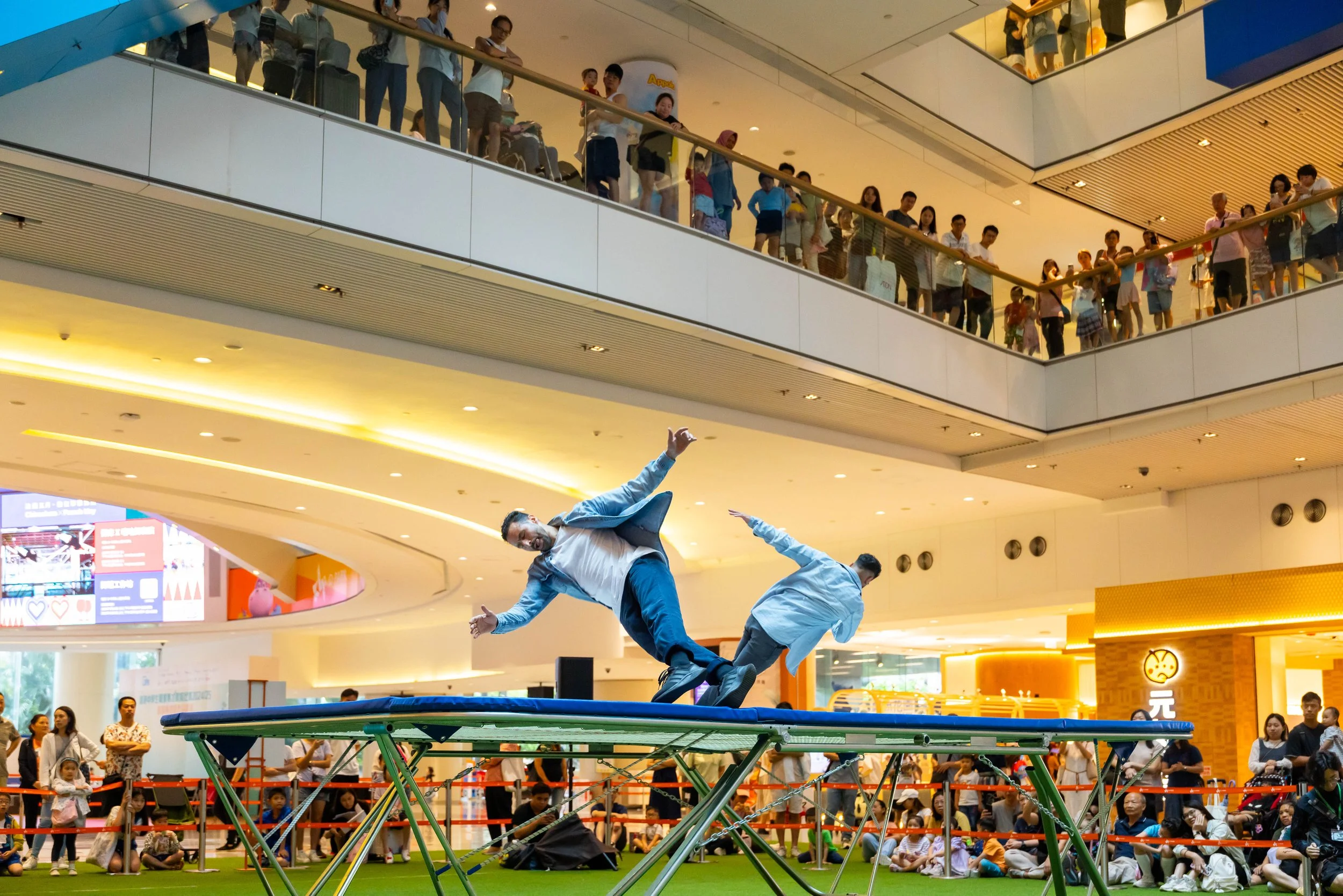 LORE invited Cie Racines Carrées and Nabil Ouelhadj's acclaimed production "9.81" for its Hong Kong debut. and ensured the handling of a 355-kg Olympic trampoline at three shopping malls: Central Market, Nina Mall, and D·Park.